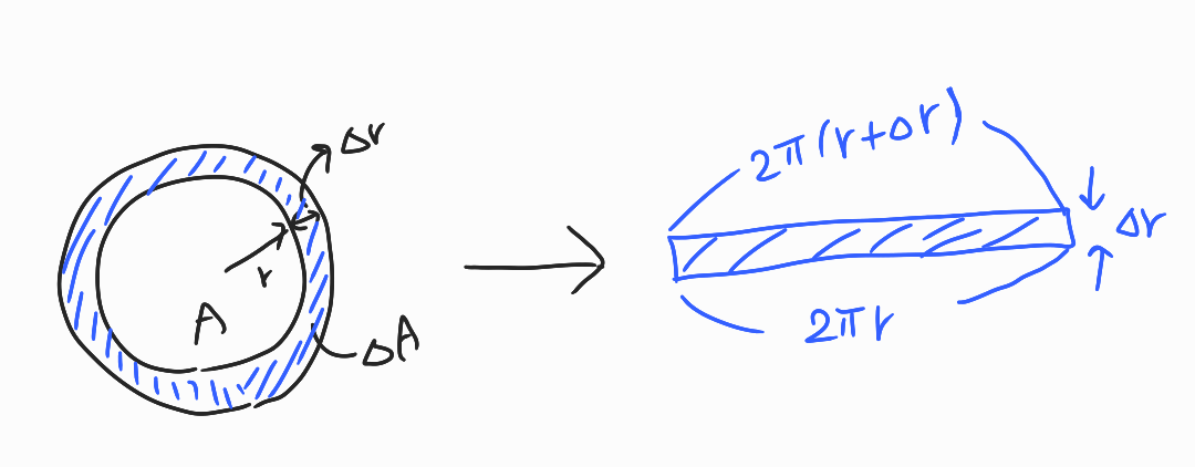 A를 r로 미분한 결과입니다. 결과는 나왔는데, 직관적으로도 이해해봅시다. 위 그림에서 넓이의 변화량 부분을 길게 펴면 아래와 같습니다. r의 변화량인 $\Delta r$을 0으로 보내면, 넓이의 변화량은 직사각형의 넓이와 같아집니다. r에서 둘레를 곱한 결과가 넓이인 것입니다. 비례 상수가 둘레인 것이죠. 따라서 r에 대한 A의 변화율은 $ 2\pi r$ 이 됩니다.