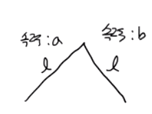 이러한 평균이 사용되는 상황을 알아봅시다. 우리가 아래 그림의 산을 오른다고 합시다. 올라갈 때와 내려갈 때의 거리는 $l$로 동일하다고 합시다. 올라갈 때의 속력은 a, 내려갈 때의 속력은 b입니다. 이때 평균속력이 조화평균입니다. 한번 직접 구하며 확인해봅시다.